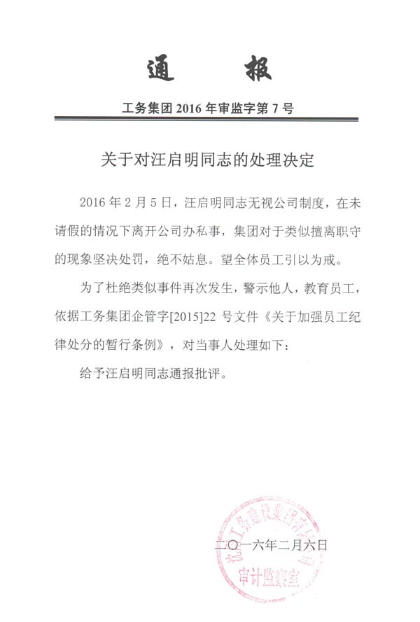 工務集團2016年審監(jiān)字第7號《關于對汪啟明同志的處理決定》