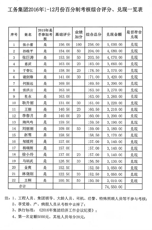 工務(wù)集團2016年度百分制考核、綜合測評兌現(xiàn)獎金統(tǒng)計