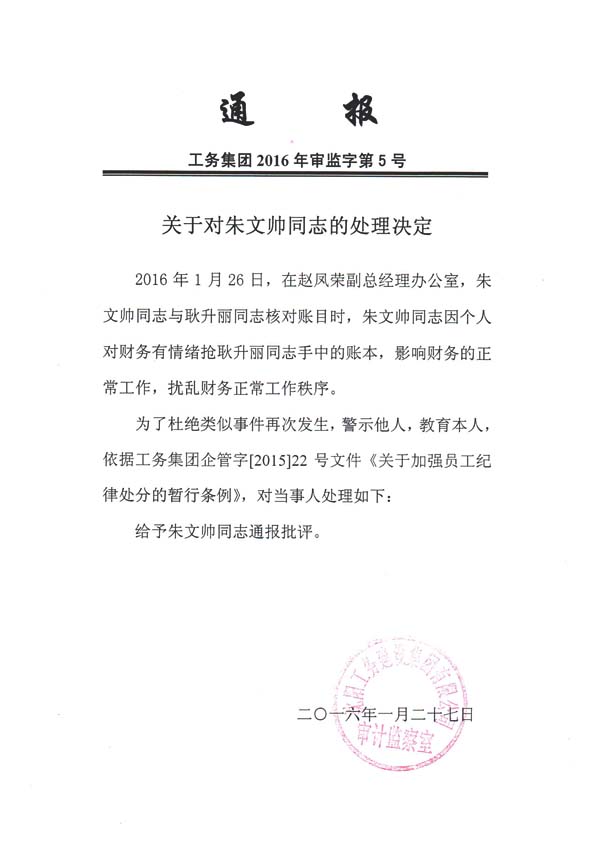 工務(wù)集團(tuán)2016年審監(jiān)字第5號(hào)《關(guān)于對(duì)朱文帥同志的處理決定》
