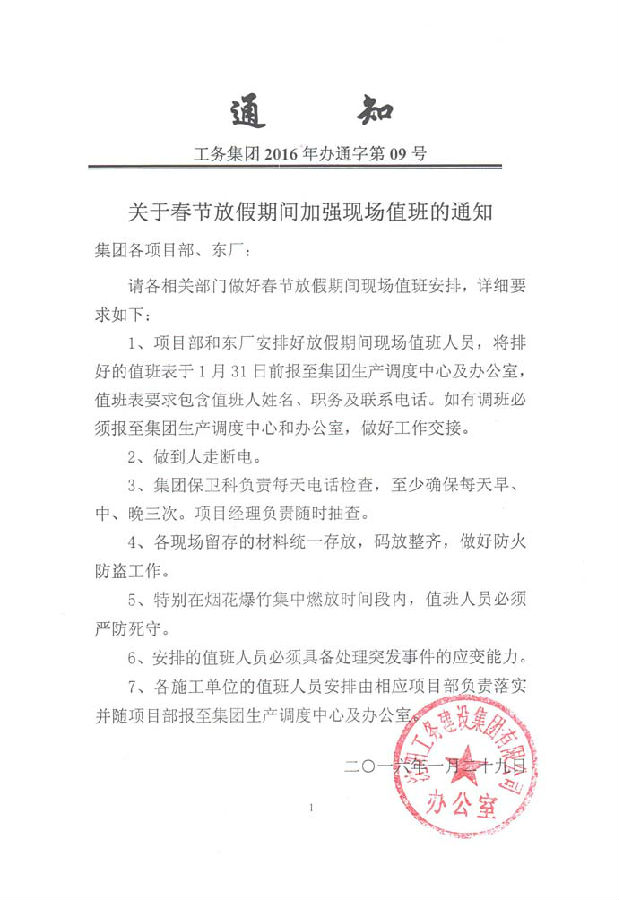 工務集團2016年辦通字第09號《關于春節(jié)放假期間加強現(xiàn)場值班的通知》